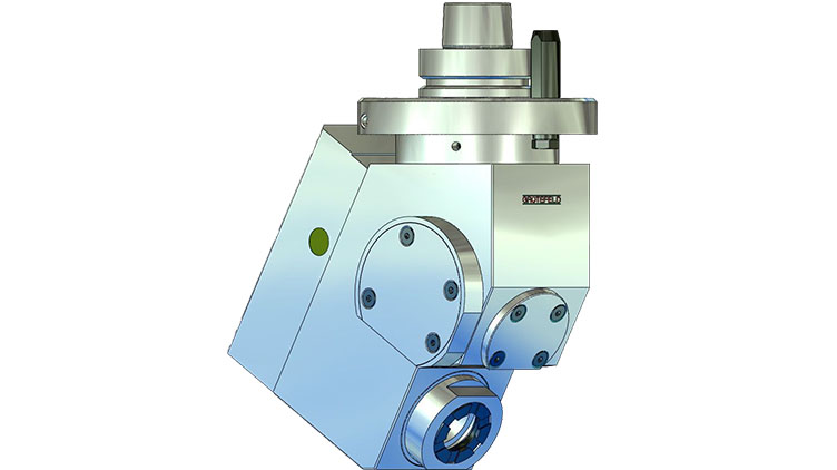 W56 角銑頭配備加工主軸,可在向上 15° 至最大向下 31° 的范圍內以固定角度布置。之后無法更改指定的角度。主軸的旋轉方向與驅動器的旋轉方向相反。驅動速度以 1:2.06 的比例傳輸到刀架。間歇運行時主軸最高轉速可達 16,000 rpm。